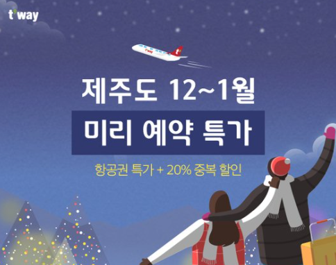 티웨이항공에서 진행하는 프로모션으로 12~1월 제주도로 출발하는 티켓이며 티웨이 홈페이지와 앱을 통해 구입이 가능하다. 각각 김포~제주 14,000원 / 대구~제주 15,400원 / 광주~제주 14,900원 / 청주~제주 16,400원 / 부산~제주 14,400원의 금액.
